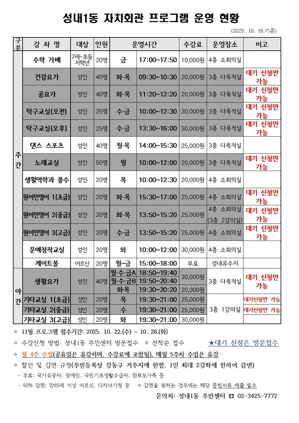 2025년 11월 성내1동 자치회관 운영 프로그램 안내